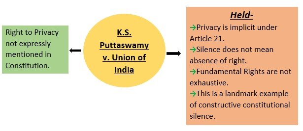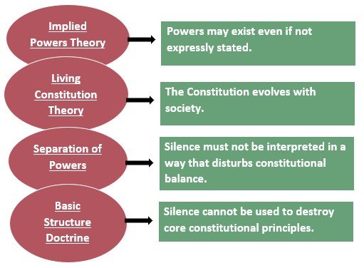 The Doctrine of Constitutional Silence plays a crucial role in Indian constitutional interpretation. Where the Constitution is silent, courts: