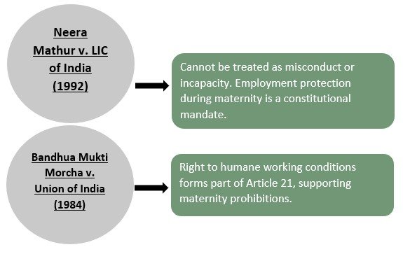 The prohibition of employment during maternity under Section 4 of the Maternity Benefit Act is an absolute and mandatory safeguard designed to protect the health, dignity, and reproductive rights of working women. Judicial interpretation and constitutional principles reinforce that no woman can be compelled or permitted to work during vulnerable maternity periods, and any violation attracts penal liability.